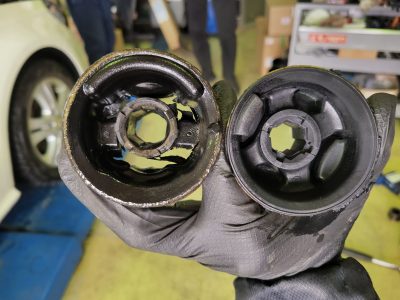 上が交換させて頂いた部品になります。新品と比べるとブッシュが瘦せ細ってるのが分かりますね…。振ってみるとカタカタ言ってました(笑)